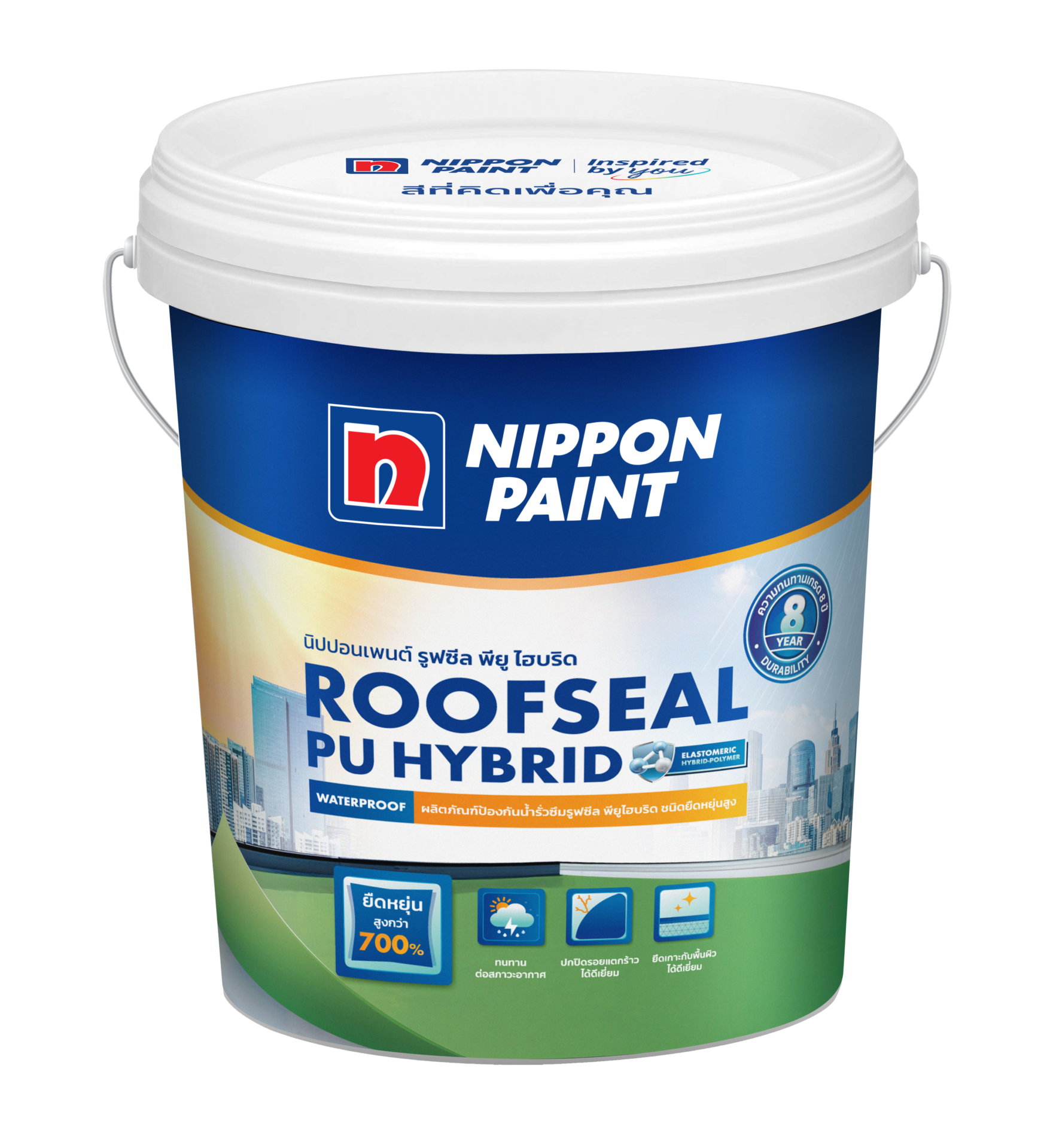 นิปปอนเพนต์ รูฟซีล พียู ไฮบริด ผลิตภัณฑ์ไฮบริดโพลียูรีเทนผสมอะคริลิกชนิดยืดหยุ่นสูงทนทานสูง ป้องกันและแก้ไขปัญหาน้ำรั่วซึม นิปปอนเพนต์ รูฟซีล พียู ไฮบริด (Nippon Paint Roofseal PU Hybrid) ผลิตภัณฑ์ไฮบริดโพลียูรีเทนผสมอะคริลิกชนิดยืดหยุ่นสูง ด้วยเทคโนโลยี Elastomeric Hybrid-Polymer ที่ยืดหยุ่นได้สูงถึง 700% ทนต่อการขังน้ำได้นานกว่า 180 วัน โดยฟิล์มสีไม่บวมพองหรือหลุดล่อน อีกทั้งยังทำหน้าที่เสมือนฉนวนป้องกันความร้อน ช่วยสะท้อนแสงแดด และทนทานต่อแสงยูวีและสภาพอากาศภายนอก เหมาะสำหรับใช้งานทั้งภายในและภายนอก เพื่อป้องกันและแก้ไขปัญหาน้ำรั่วซึมบริเวณดาดฟ้า หลังคา ระเบียง รอยต่อต่าง ๆ และผนังอาคาร เช่น ผนังคอนกรีต ผนังเบา (ยิปซัมบอร์ด), เมทัลชีท, หลังคาเหล็ก และวัสดุโลหะอื่น ๆ